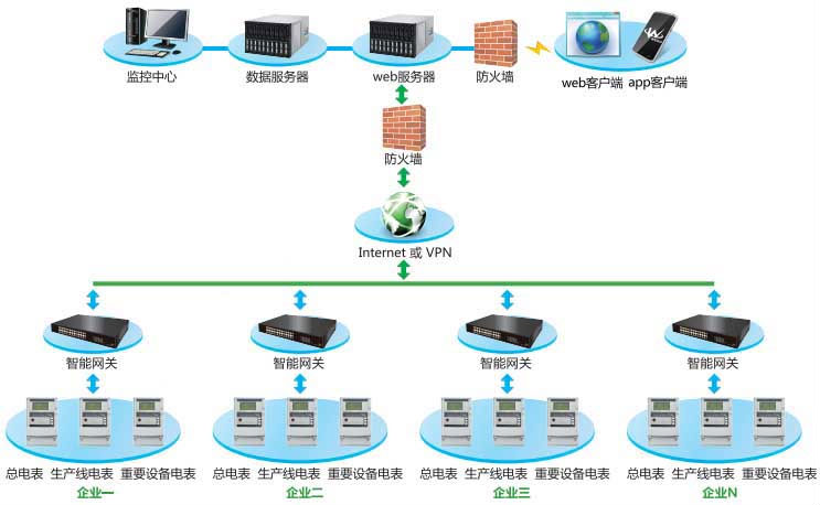 2.、接入层以企业为单位建立能耗数据采集点;对企业内部总电量、重要生产线路、重要耗能设备等有用数据进行采集。